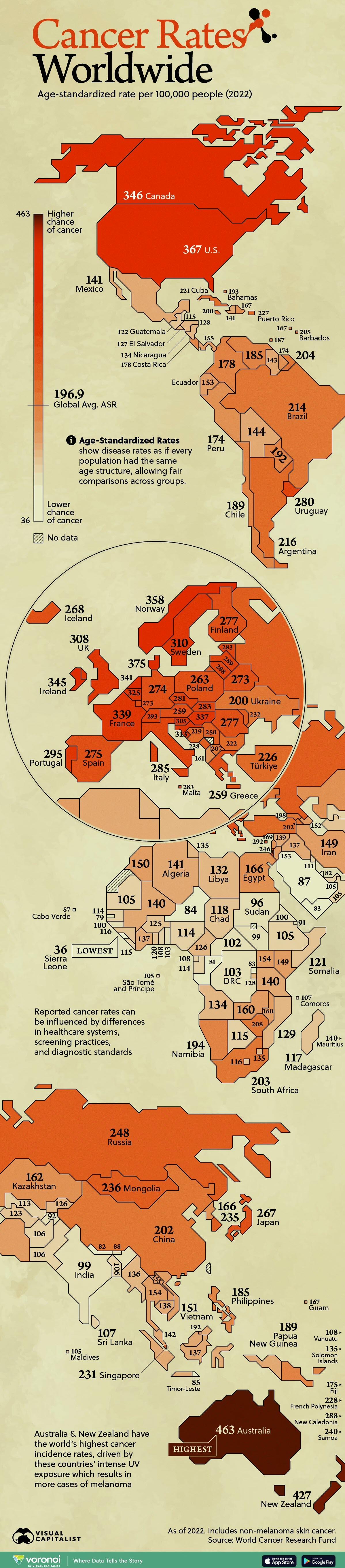 In this infographic, Visual Capitalist’s Marcus Lu shows age-standardized cancer incidence rates across 180+ countries, revealing striking contrasts between different regions. Understanding these differences sheds light on how lifestyles, environment, and healthcare reporting all contribute.