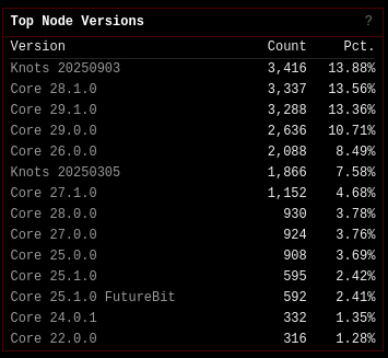 As the battle for the future of Bitcoin heats up, of which I’ve made several posts, it’s noteworthy that Bitcoin Knots has become the number one version, and I suspect that the industry and money behind the Bitcoin Core corruption is spinning up Bitcoin Core versions to skew the numbers. So legitimate node runners might indicate a much higher percentage than the indicated 22% presently. And I notice my two Bitcoin Knots nodes running on Raspberry Pi 5’s full time use a lot less data running Knots because of the SPAM filtering and not relaying it unless it gets included in a block.