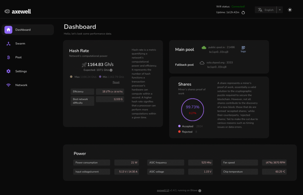 AxeOS is the operating system used by the Bitaxe Hex line, and it provides a streamlined web interface for managing your miners. Users can also access the AxeOS interface and perform firmware updates or advanced configuration using a PC. Here are the key aspects of how AxeOS interacts with the different models: