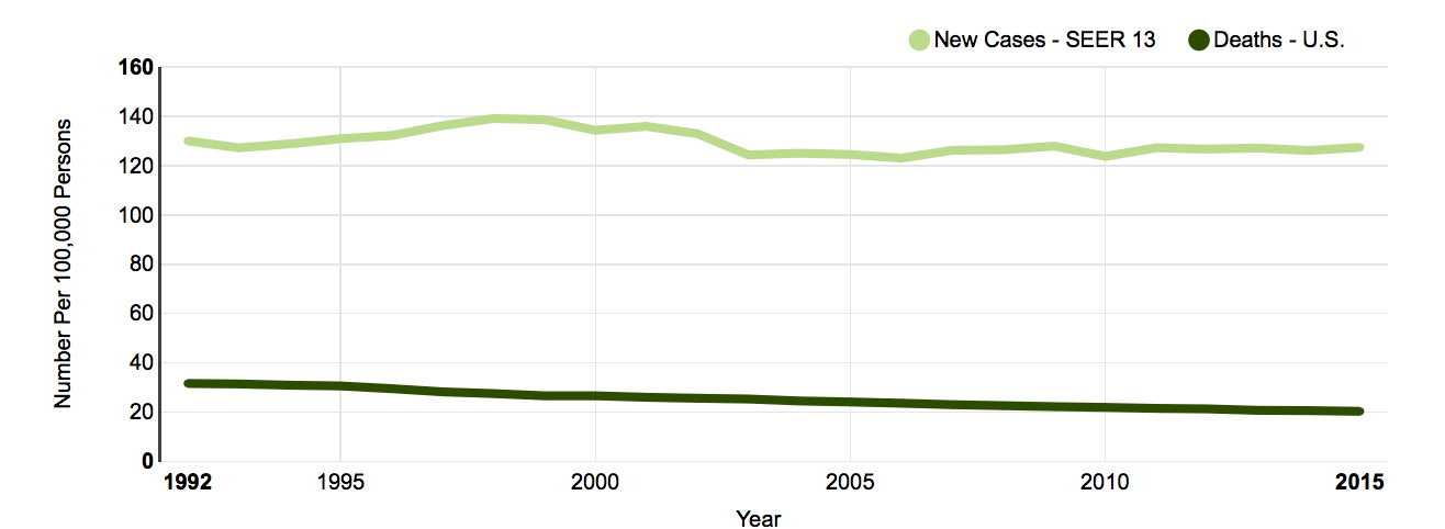 The following graph2 shows this. Between 1992 and 2015, there was no consequential decline in breast cancer deaths (lower line). All the money thrown at screening programs has just produced a slight rise in diagnoses (upper line):