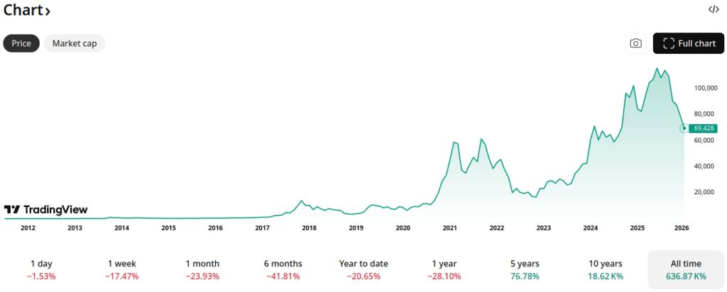 Bitcoin Lifetime Chart, 5 years it gained 76.78%, 10 years 18,620%, all time 636,870%
