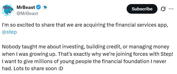 In a post to X on Monday, Donaldson said the motivation behind the acquisition was to equip young people with the tools and guidance needed to navigate personal finance from an early age.